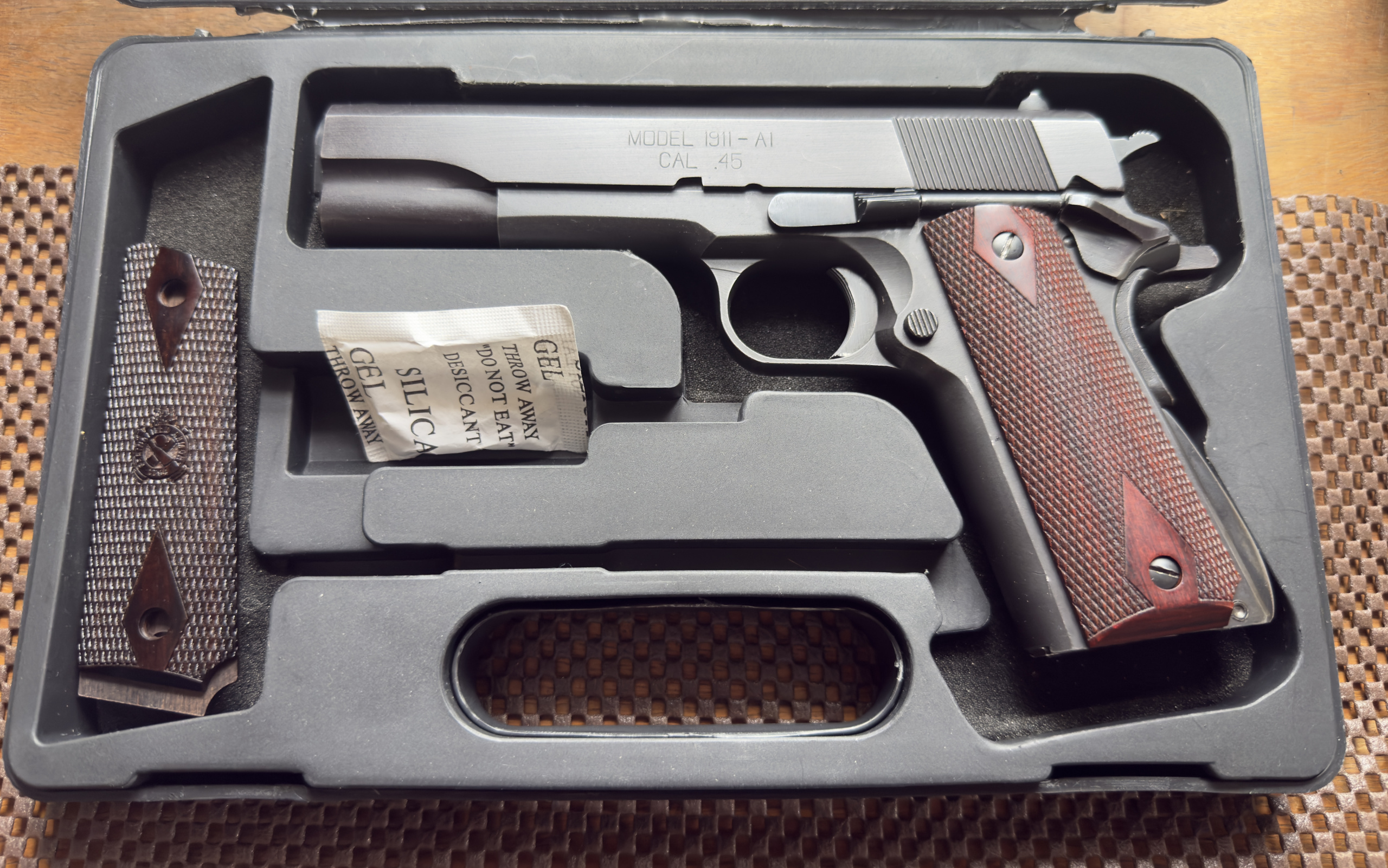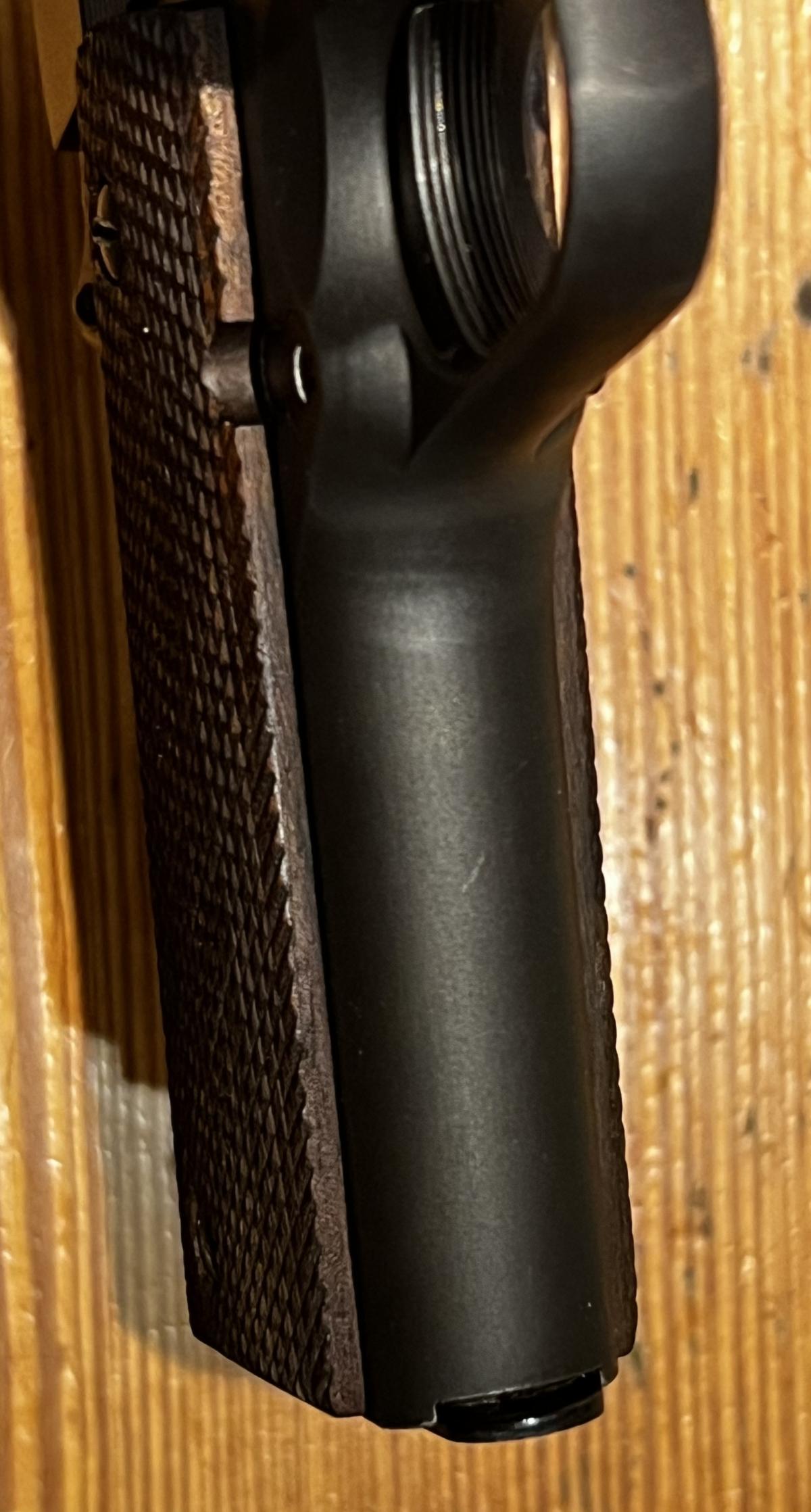 Tiene dos juegos de de cachas de madera las originales y otras colt s/ medallón. No es la forjada en brazil por Imbel, por su numeración comenzada en NM muy pocas en Argentina con dos cargadores.Uno original . Cachas de madera originales que evocan al modelo 1911. Pre A1. Posee CUIM transferencia en tfba