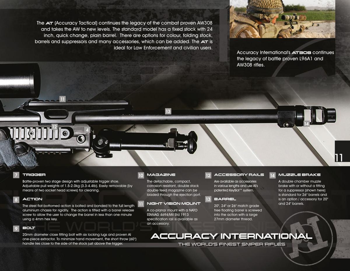 El AT (Accuracy Tactical) continúa el legado del AW308 probado en combate y lleva el AW a nuevos niveles. El modelo tiene culata plegable y cambio rápido de cañones.