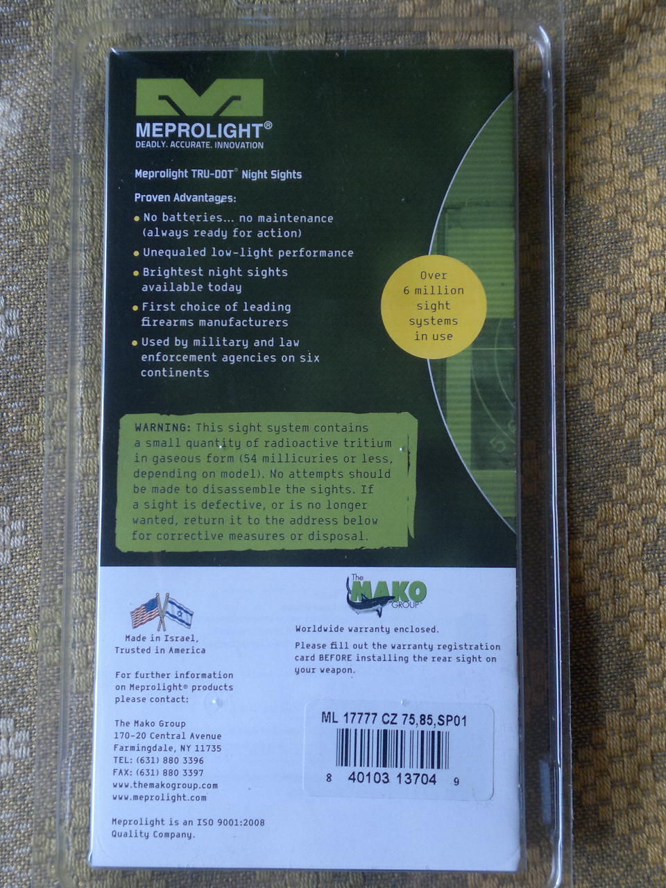 ALZA Y GUION METALICA MARCA MEPROLIGHT TRU-DOT. PARA PISTOLAS MARCA CZ 75, 85 SP 01. NUEVA A ESTRENAR EN SU BLISTER ORIGINAL.