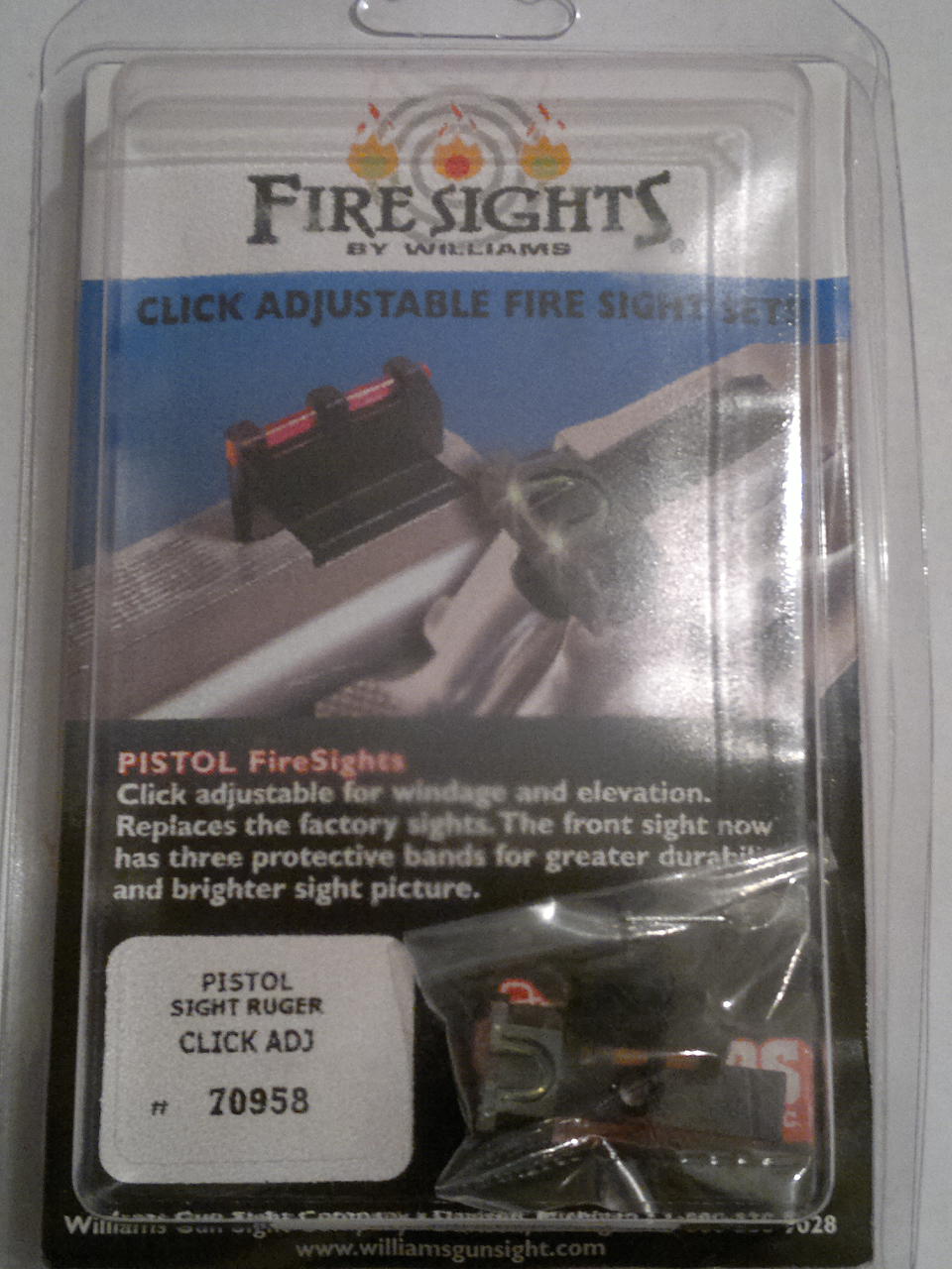 ALZA Y GUION METALICO DE FIBRA OPTICA MARCA WILLIAMS PARA REVOLVERES RUGER GP-100, REDHAWK. NUEVO A ESTRENAR EN SU BLISTER ORIGINAL.