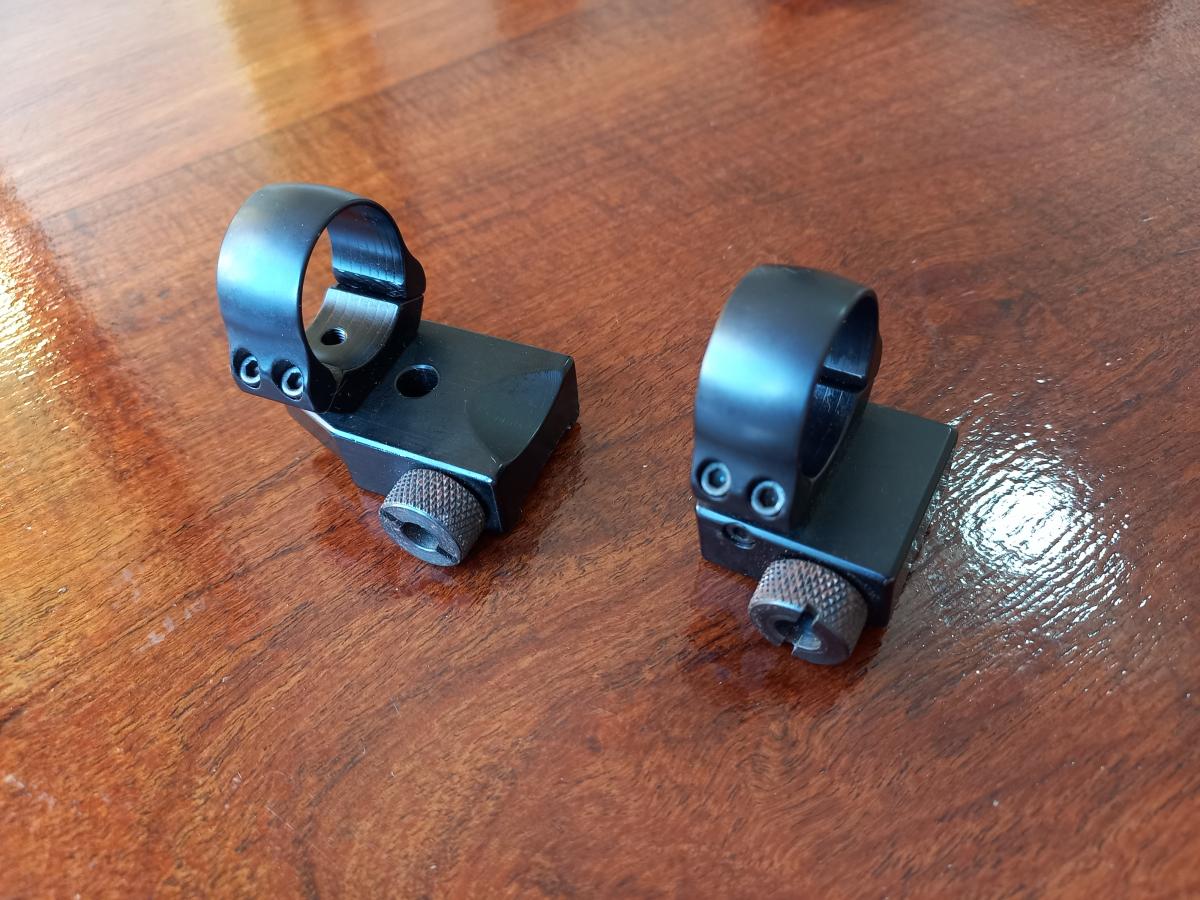 Anillas y montaje para CZ 550 y para BRNO 602. Están fabricadas en aluminio de altísima calidad. Son para miras de 25,4 mm (Una Pulgada) y la anilla delantera tiene extensión mediante dos puntos de alclaje. Las anillas se ensamblan a los montajes mediante un tornillo desde parte inferior. Muy poco uso y muy buena calidad. Se venden  U$S 130.