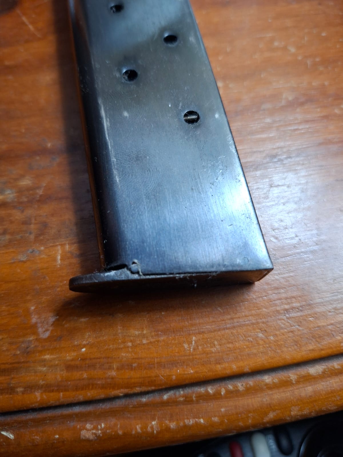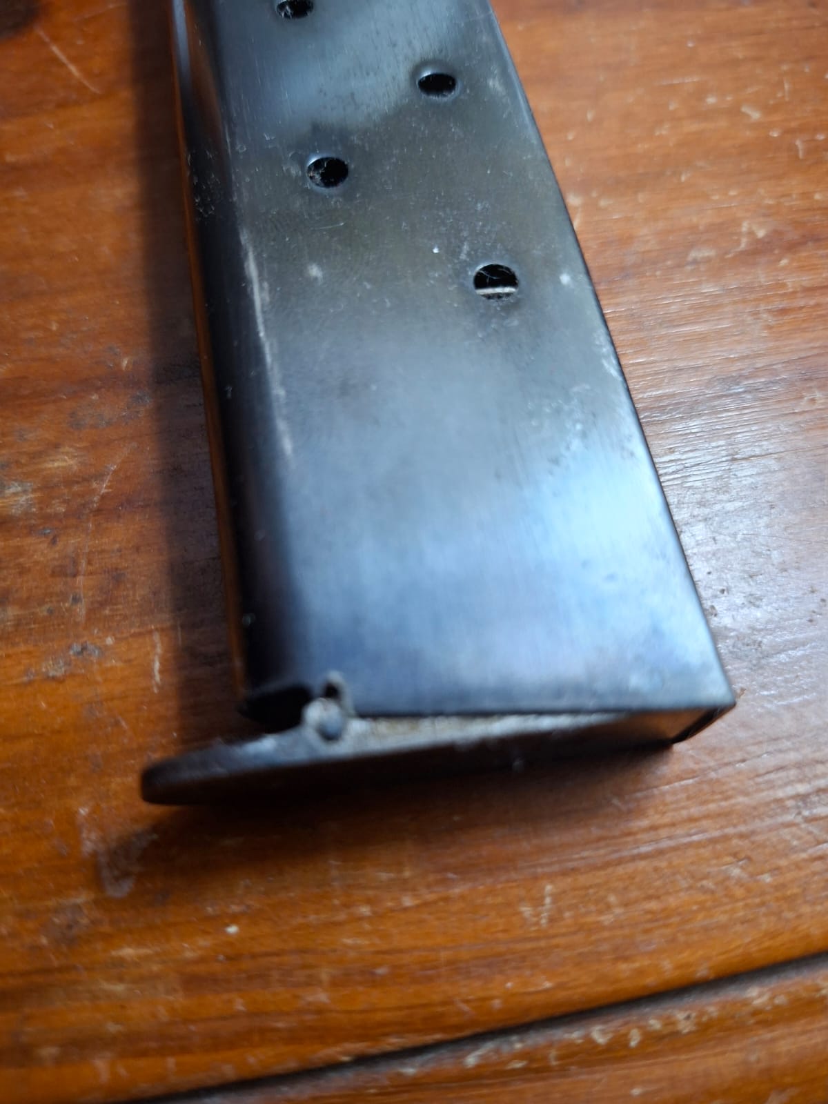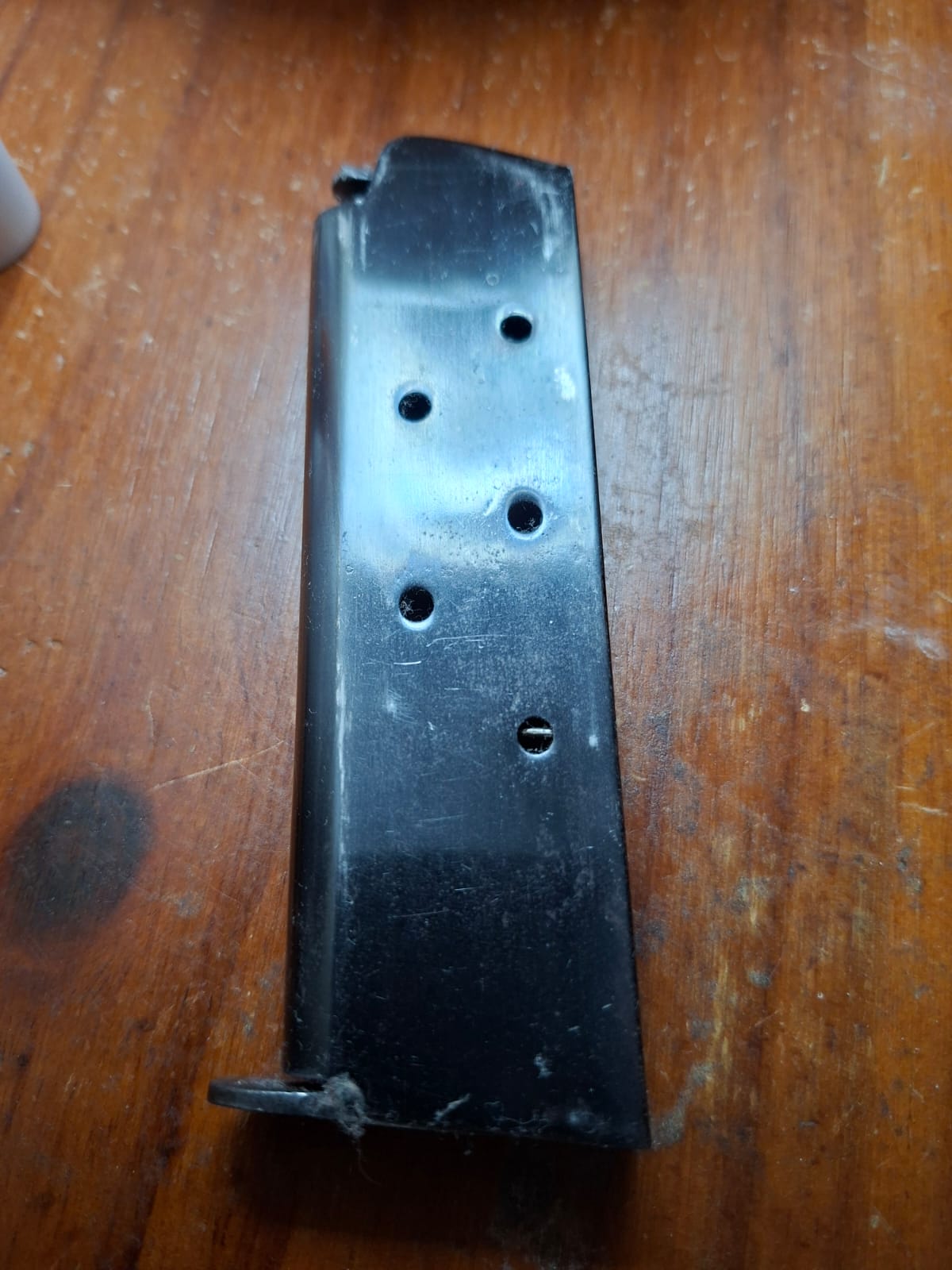 Vendo cargador original de Sistema Colt 1927, se le debe arreglar el perno delantero de la base que se rompió y se llega a salir de lugar como se puede apreciar en la foto. Funciona sin problema con carga parcial (es decir entre 4 y 5 municiones).