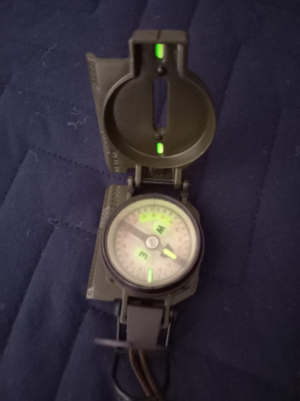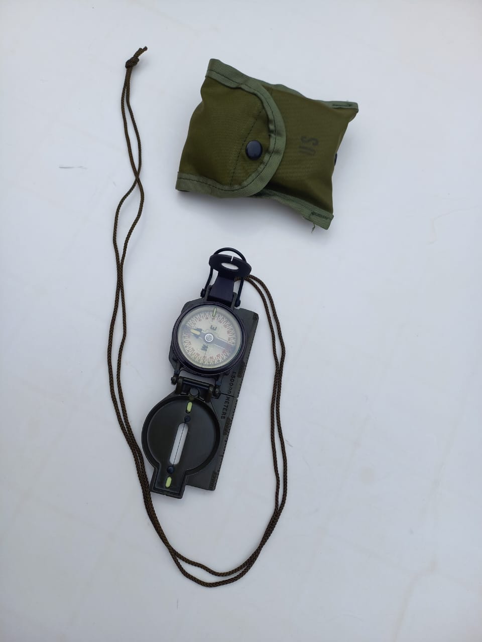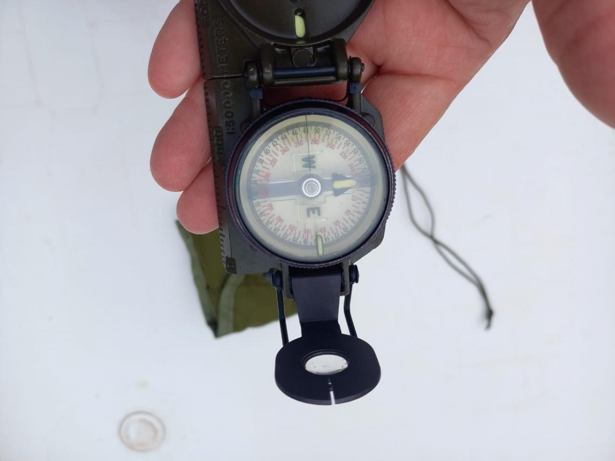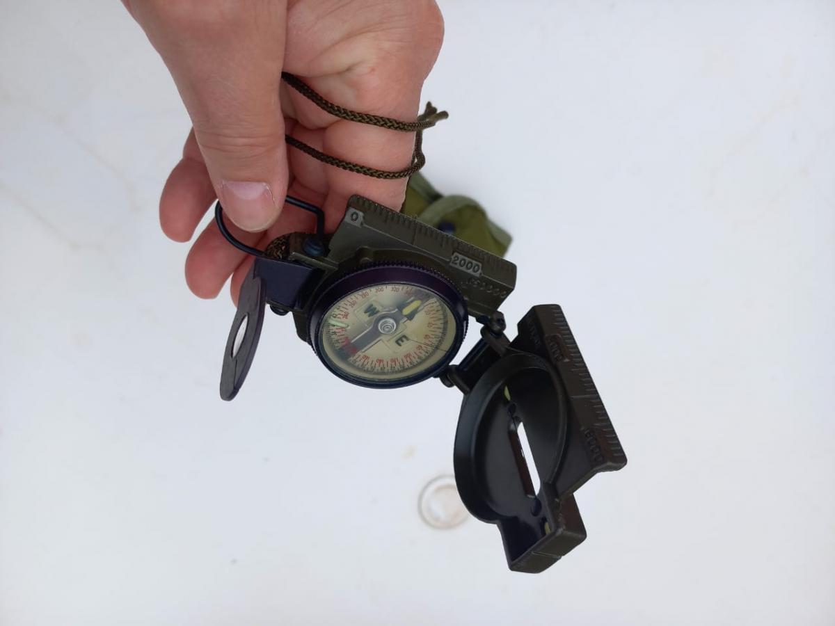 Compás Magnético de Marcha o Brújula, usado por el Ejército Argentino y fabricado por la Miller Elect. Corp. En la ciudad de Grand Haven, Michigan EEUU, en la época de la Guerra de Vietnam. Como toda brújula, sirve para marcar el Norte Magnético de la Tierra y así obtener una correcta orientación. La brújula tiene la escala de los grados de los cuadrantes desde 0 hasta 360 grados. Por fuera de éstos, tiene marcaciones que no recuerdo la utilidad y que van desde 0 hasta 64, este último marcaje, coincidente con el 360. Tiene puntos clave marcados con material fosforescente que brilla muy bien y por largo rato (Foto 10). Posee una tapa con un retículo fino a modo de pelo vertical y otra tapa con una lupa y una caladura vertical. Haciendo coincidir el retículo con la caladura se observa los grados exactos en la escala de la brújula. Sinceramente hace más de 40 años sabía manejarlo con el mapa para obtener coordenadas. Nunca más usé y me he olvidado. Voy a adjuntar un video en el que se enseña el método para su uso. Se entrega con su estuche original de transporte confeccionado en tela sintética impermeable y con el cordón de cuello.