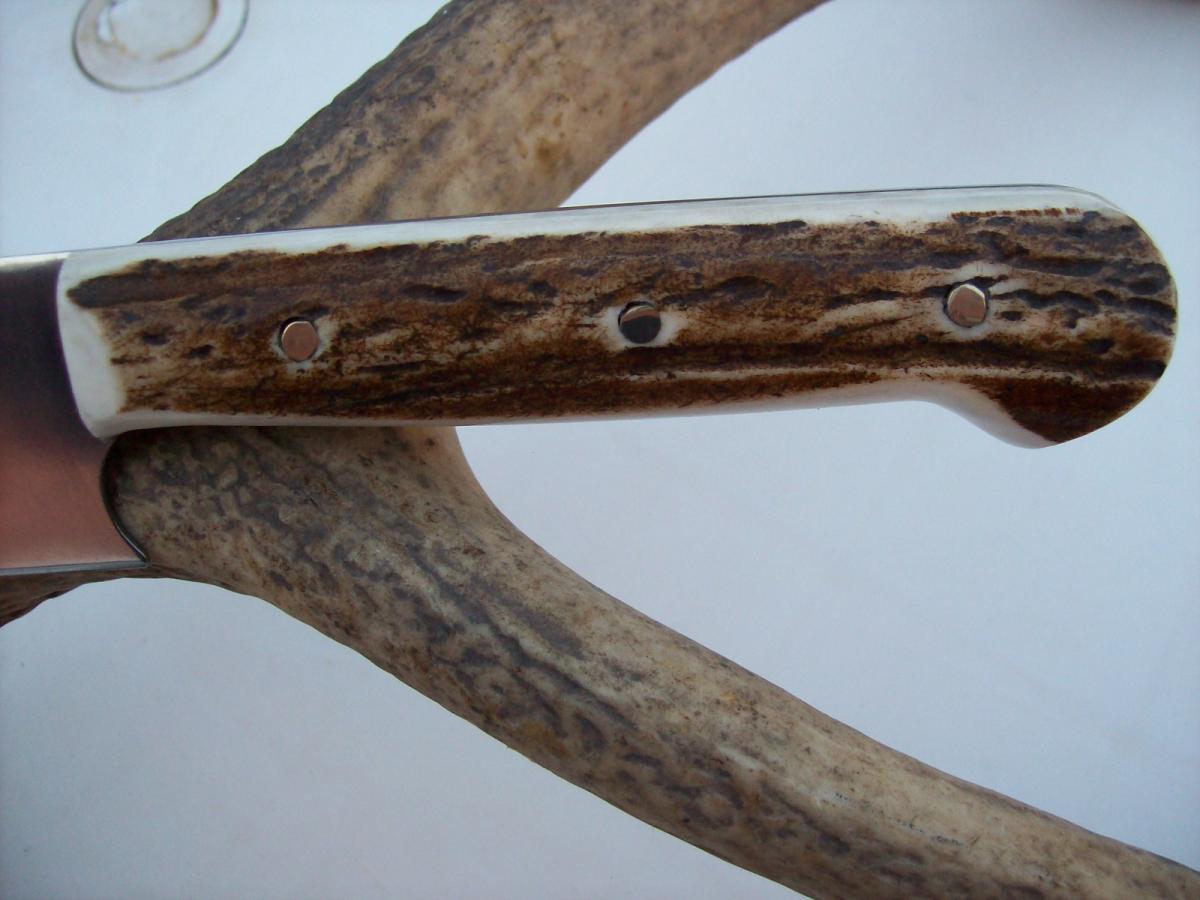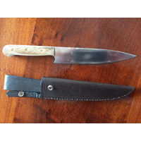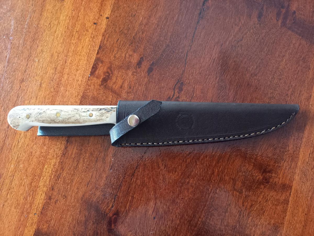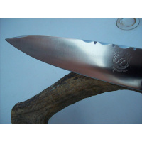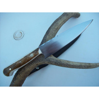 Cuchillo Criollo marca VL, fabricado por el artesano en cuchillería Víctor López. La hoja es de muy duro acero inoxidable alemán 420 Krupp, encabado con cachas de aspa de ciervo colorado, con tres pines de bronce. En el plano izquierdo de la hoja y cerca del mango, está estampada bajo relieve el logo de la marca VL (Víctor López). Es de punta caída en los últimos 47 mm donde presenta un falso filo que lo hace muy entrador. Es liviano y tiene muy buen equilibrio entre el mango y la hoja, virtud que le confiere la posibilidad de uso prolongado sin producir cansancio. La forma de la hoja lo hace un cuchillo sumamente apto para el desangrado, cuereado, desposte y defensa, incluso para uso diario. El tamaño y forma de mango brinda mucha comodidad en el manejo. Se entrega con una vaina de suela con pasacinto y solapa con broche de seguridad, con la marca “VL – Hand Made – Argentina”, repujada. Excelente cuchillo, orgullo de la Industria Argentina. Se encuentra nuevo sin uso y con excelente filo de fábrica. Sus medidas son: Largo de la hoja: 175 mm, Largo del mango: 110 mm, Largo total: 290mm, altura de la hoja: 38mm, espesor de la hoja 3 mm.