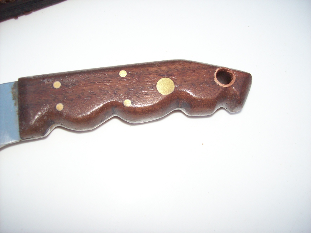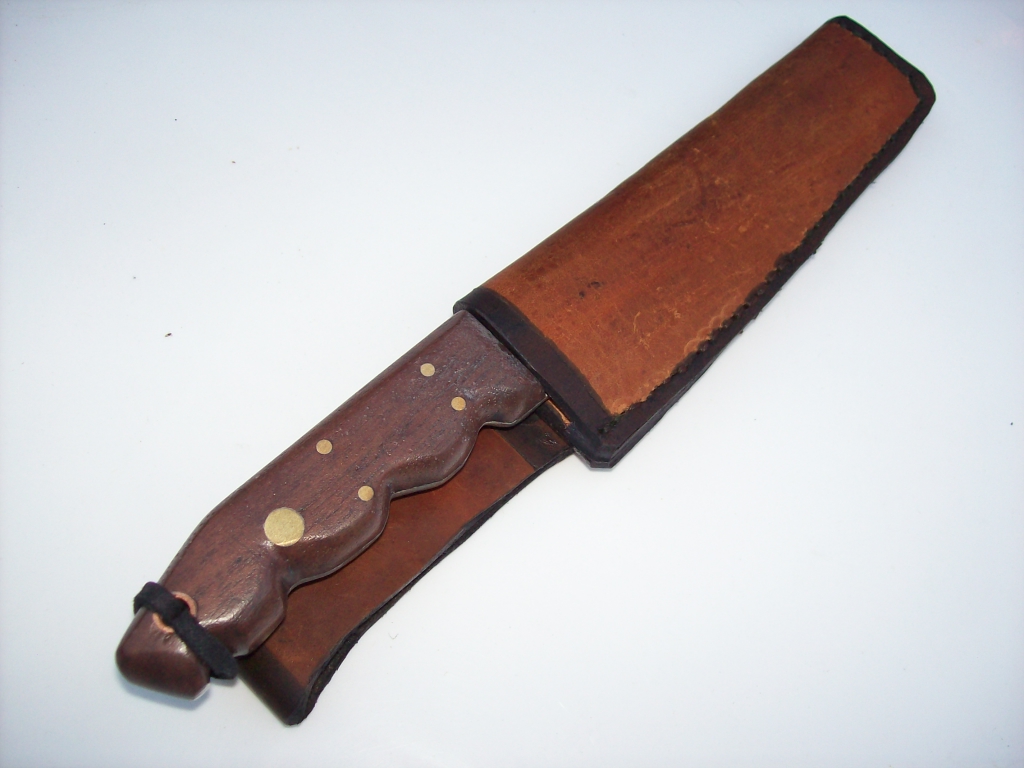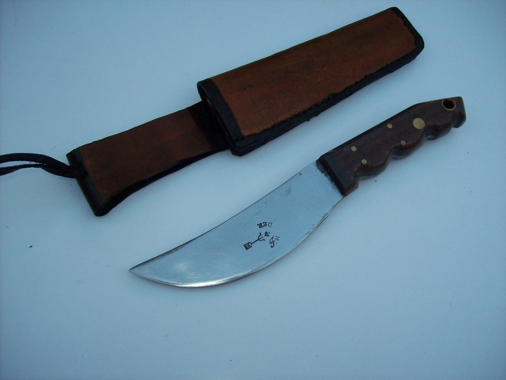 Antiguo cuchillo Skinner marca Friedrich HERDER. Largo total 23,8 cms. Hoja de 13 cms de largo, 37 mm de altura y 2,5 mm de espesor. La hoja sobre su cara izquierda, tiene grabada bajorrelieve, la leyenda FRIEDR.HERDER con el antiguo logo de la marca (con cierto desgaste). Se halla usado con filo. A pesar de su gran dureza, son hojas que se afilan con relativa facilidad, merced al preciso vaciado original de fábrica. La hoja tiene una curvatura entrante en el lomo, la que luego se eleva y sobrepasa el nivel del mango. La parte del filo es de curvatura saliente. Los primeros 5 cms del lomo en la punta, tienen filo, convirtiéndolo en un cuchillo “muy entrador”. La punta aguzada, la curvatura delantera del filo, el bajo peso y el exquisito filo que toman estas hojas hacen a este cuchillo ideal para desangrar, cuerear y despostar la presa de caza. Está encabado con dos cachas de madera dura tomadas a la hoja mediante cinco remaches de bronce y un agujero pasahilo. Se entrega con una vaina de fuerte suela genuina, con pasacinto y tiento de seguridad.