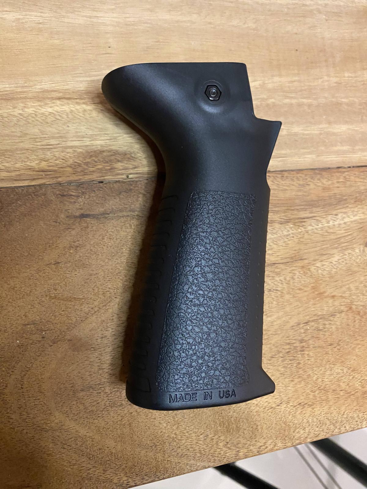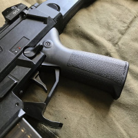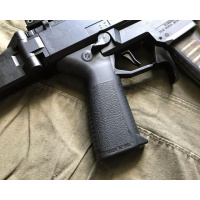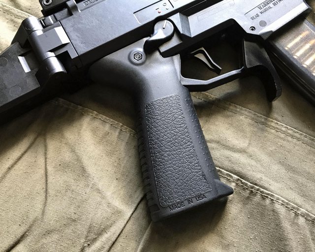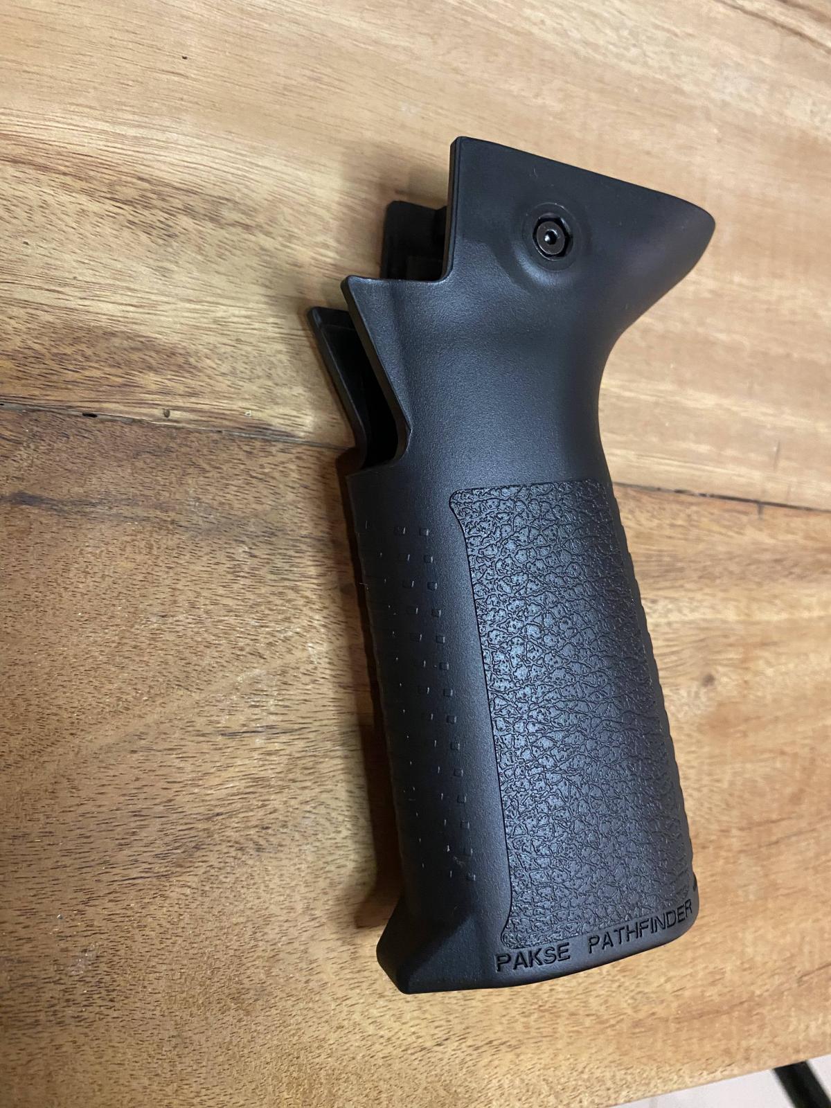 Empuñadura de repuesto Pathfinder para la pistola CZ Scorpion, diseñada y fabricada por Pakse. Esta empuñadura está fabricada con polímero reforzado con fibra de alta temperatura y presenta un ángulo más vertical que la empuñadura original, lo que permite al usuario flexionar el codo para una postura más compacta al operar el arma.