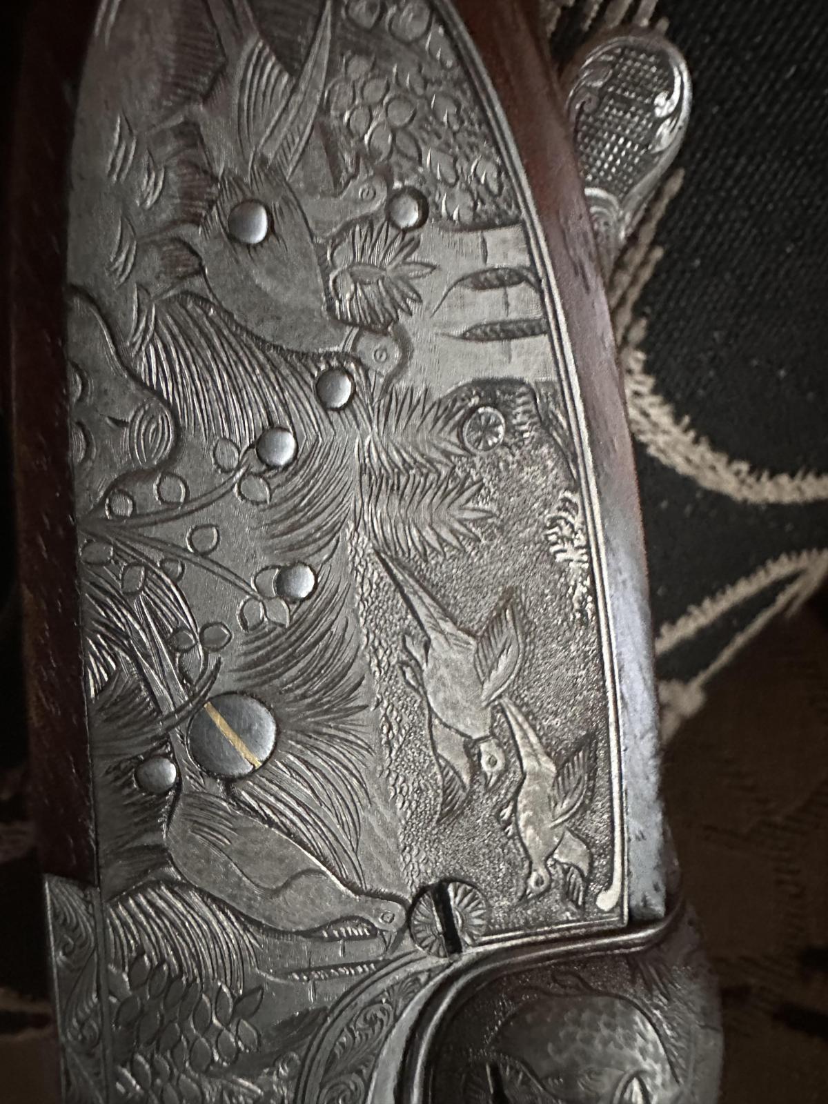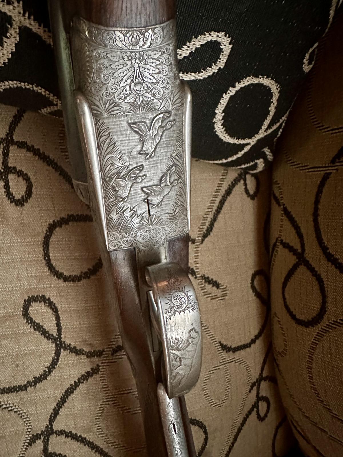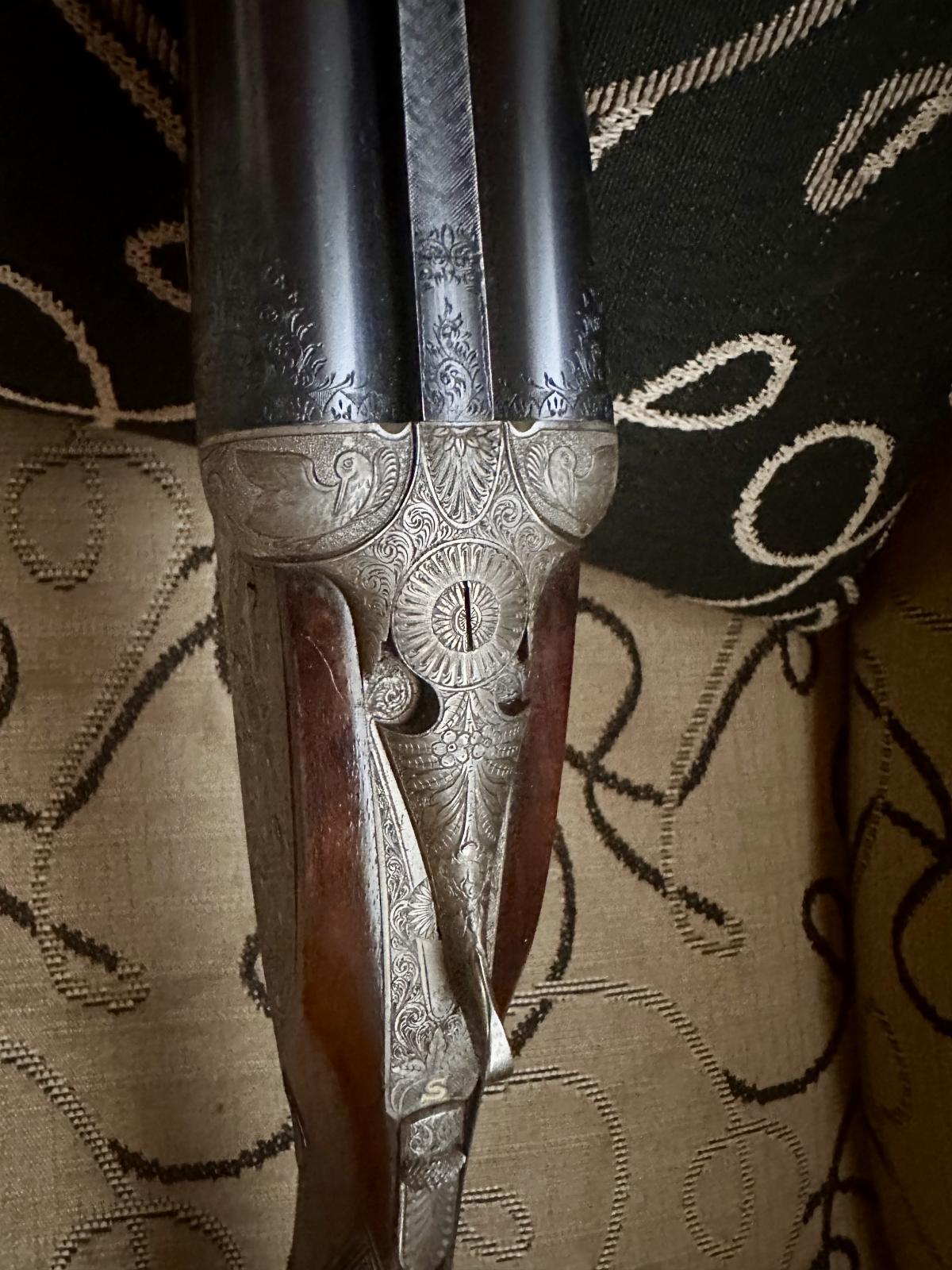 Distinguida escopeta Víctor Sarrasqueta de lujo mod 213E indicadores de disparo en oro 24 , extractores automáticos, maderas de nogal seleccionado alto grado, imágenes de caza hechas a mano