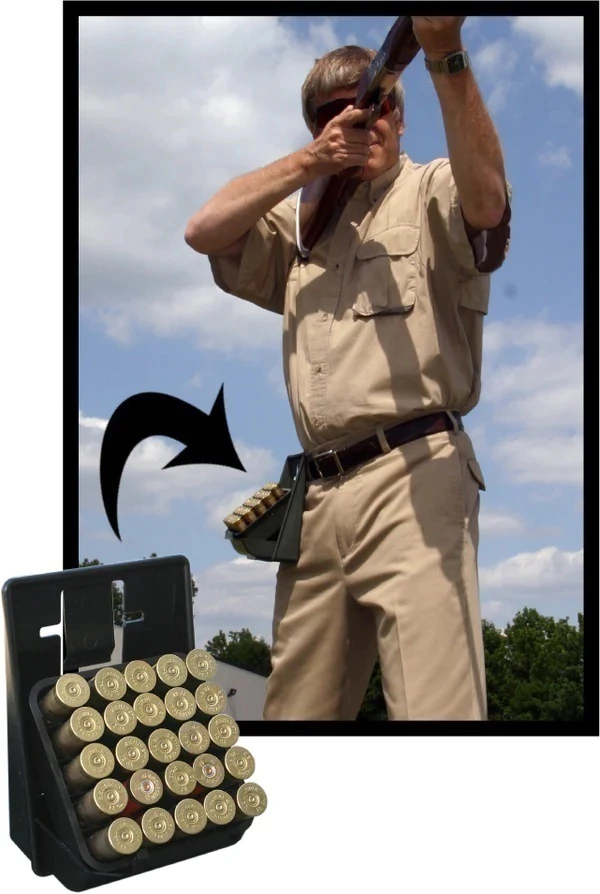 Dentro del SH100 se encuentran cuatro bandejas para 25 cartuchos de perdigones, además de un exclusivo clip para cinturón Hip Hanger. Simplemente deslice la bandeja en el Hip Hanger y fíjela a su cinturón o bolsillo. Los cartuchos se mantienen en un cómodo ángulo de 45° para una rápida recuperación, ideal para la caza de palomas y patos, skeet, foso y platos deportivos. El portacartuchos elimina la necesidad de la bolsa de cartuchos en los campos de foso y skeet. Hay espacio para el resto de su equipo de tiro. Para un día fantástico en el campo de tiro.
