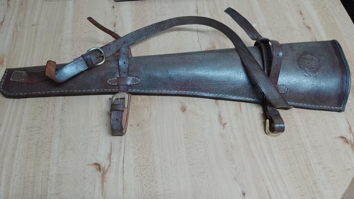 Excelente funda de cuero , color marron, para arma larga . Largo exterior 90 cm., ancho de entrada 20 cm (interior). Con acolchado interior, en muy buen estado con muy poco uso. Posee dos riendas de ajuste.