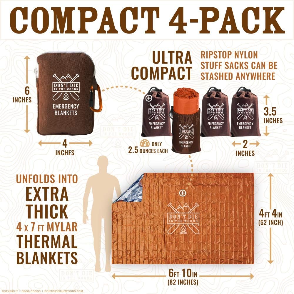 - Las mantas de emergencia más resistentes de la tierra: exclusivamente de Don't Die In The Woods, nuestro mylar HeatFlex es más grueso y flexible que las mantas espaciales normales. Combinado con un embalaje duradero diseñado ultraligero y compacto para aventuras al aire última intervensión, no encontrarás mantas de emergencia de mylar más duras en ningún lugar.