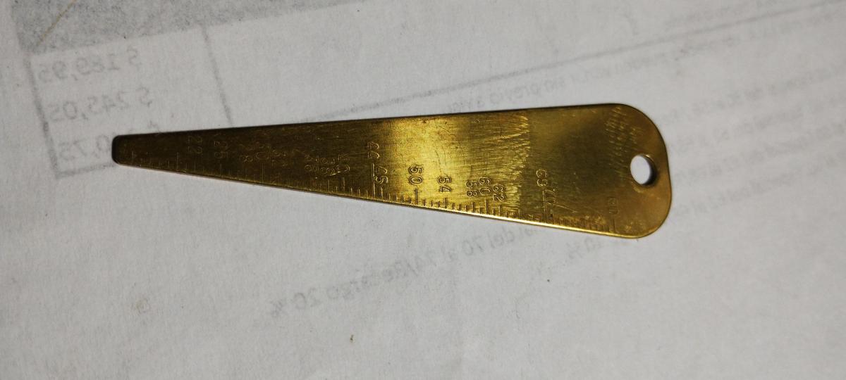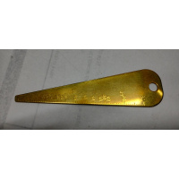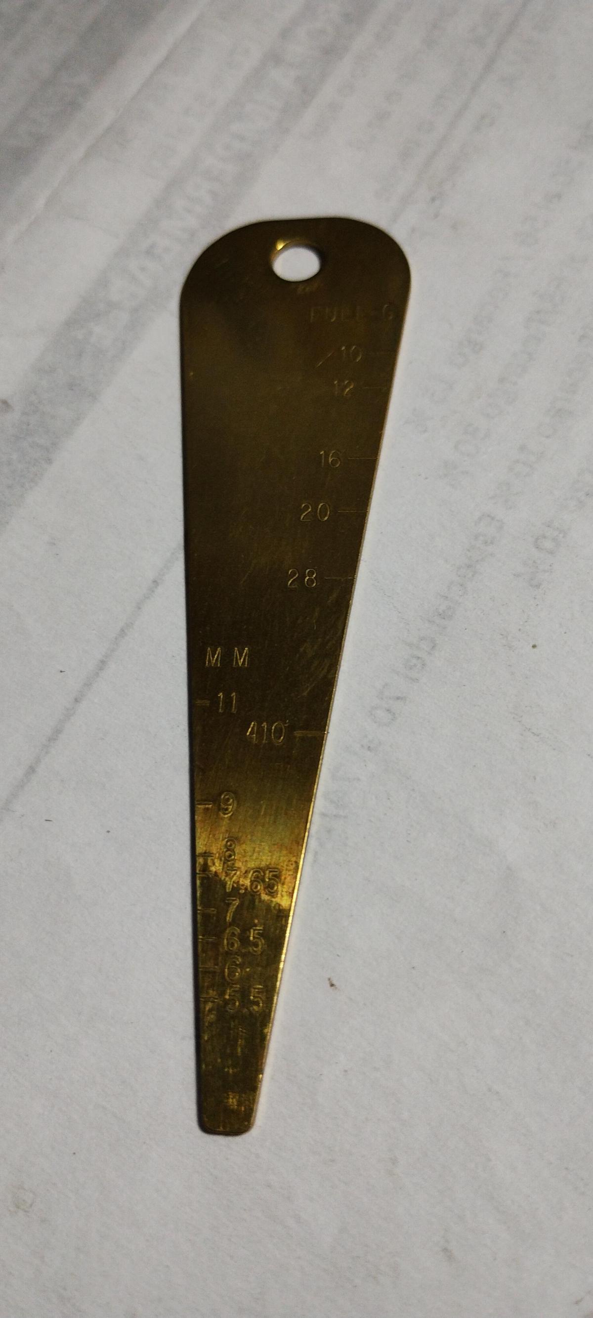 El calibrador de orificios es una herramienta resistente de latón sólido de 1mm de espesor , grabada en un lado de calibre .015 a .80, con todos los calibres populares marcados con precisión para facilitar la inspección. Un área en blanco es adecuada para grabar.
