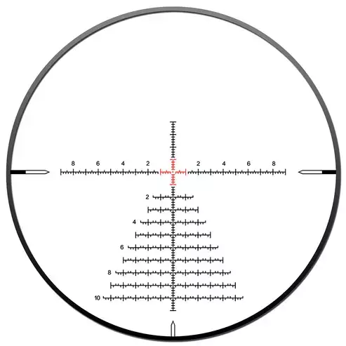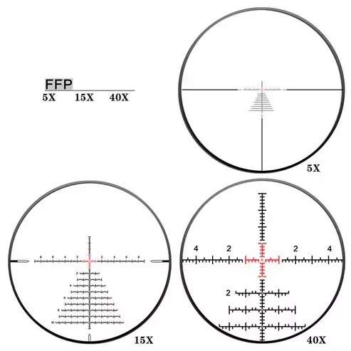 La retícula del primer plano focal (FFP) cambia proporcionalmente con el aumento, lo que permite que las escalas utilizadas para la estimación de alcance y la compensación de proyectiles muestren valores reales a cualquier aumento, lo que permite aplicar la estimación de alcance y la compensación de proyectiles con precisión en todos los aumentos. La retícula iluminada cuenta con seis niveles de brillo, lo que facilita su uso en condiciones de poca luz.