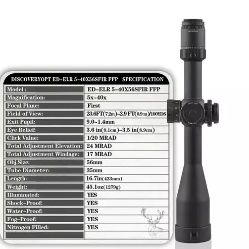 El DiscoveryOpt ED-ELR GEN II 5-40x56SFIR FFP-Z es un visor de alta calidad, diseñado específicamente para tiro a larga distancia, pensado para las necesidades de los tiradores deportivos modernos (incluso para tiros a distancias extremas) y cazadores de precisión. Con un rango de aumento de 5-40x y un diámetro de objetivo de 56 mm, este dispositivo ofrece una flexibilidad excepcional tanto a distancias medias como extremas. El tubo de 35 mm de diámetro permite amplios rangos de ajuste interno y una construcción robusta.