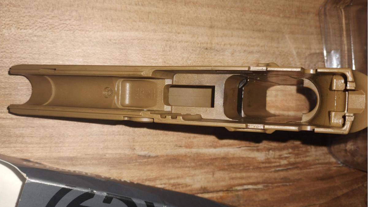 Tiene un pequeño detalle que se puede observar en la foto, en la parte superior de la ranura donde se ve en número de serie, no afecta el funcionamiento de ninguna manera, y no es perceptible. Fue durante un mal desarme del arma.