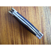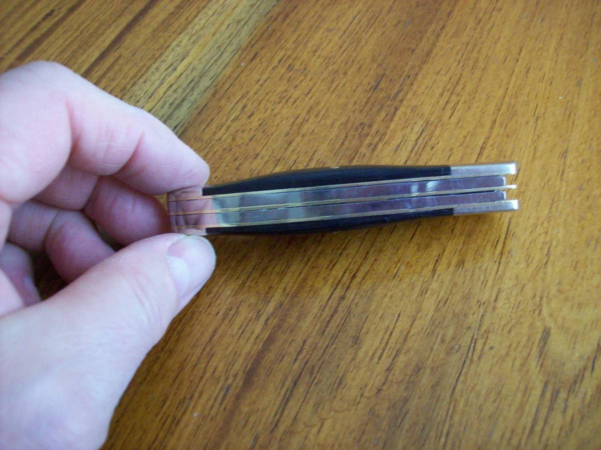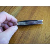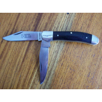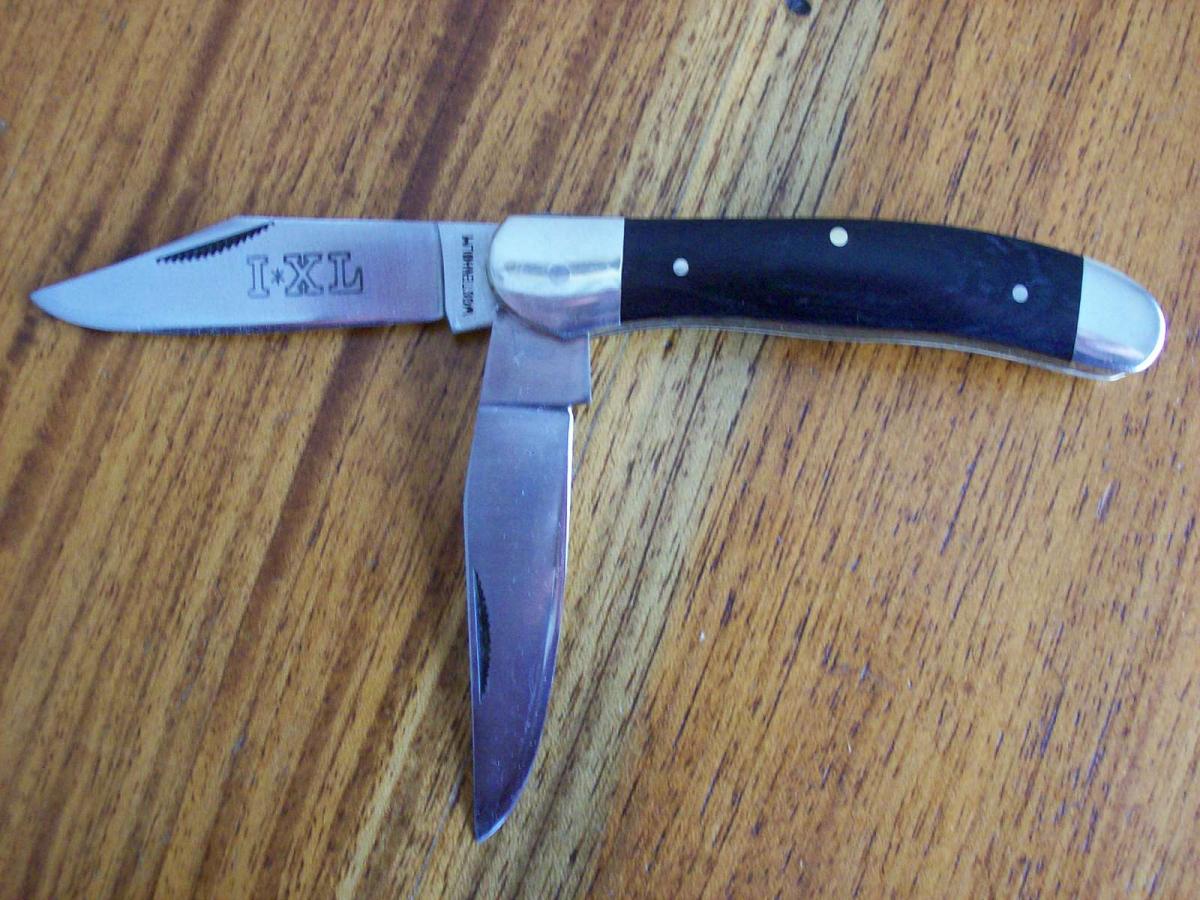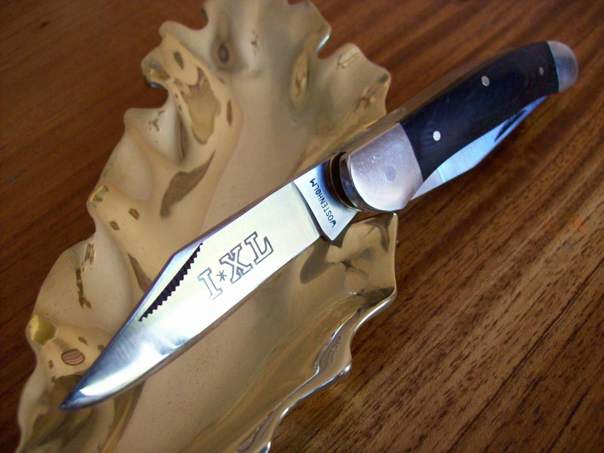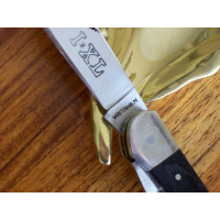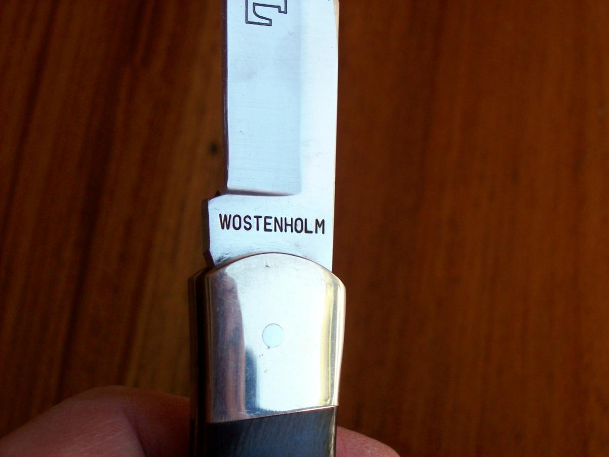 Navaja WOSTENHOLM Trampera de dos hojas. Hojas Made In Japan, ensamblada en EEUU. Estas hojas fueron importadas desde EEUU en 1980, pero cuando estaban en trámites de importación, la cuchillería PARKER de Japón presentó quiebra, y varios miles de estas hojas quedaron en almacenaje hasta hace unos años. Fueron rematadas y las adquirió una fábrica de navajas de EEUU, la que se encargó de ensamblarlas. Cerrada mide 9,6 cms y abierta 16,8 cms. Sus hojas miden 7,2 y 7 cms de largo, 15 y 17mm de altura y 2,6 y 2,8 mm de espesor. Está ensamblada con estructura de bronce, bolster de níquel y cachas de madera laminada. Sobre la cara izquierda de la segunda hoja tiene la leyenda I*XL correspondiente al modelo de navaja y cerca de pivot de la hoja tiene estampada bajorrelieve la marca WOSTENHOLM. En la cara derecha de la hoja tiene la leyenda de su origen, JAPAN. La navaja se halla nueva sin usar, sólo afilada.