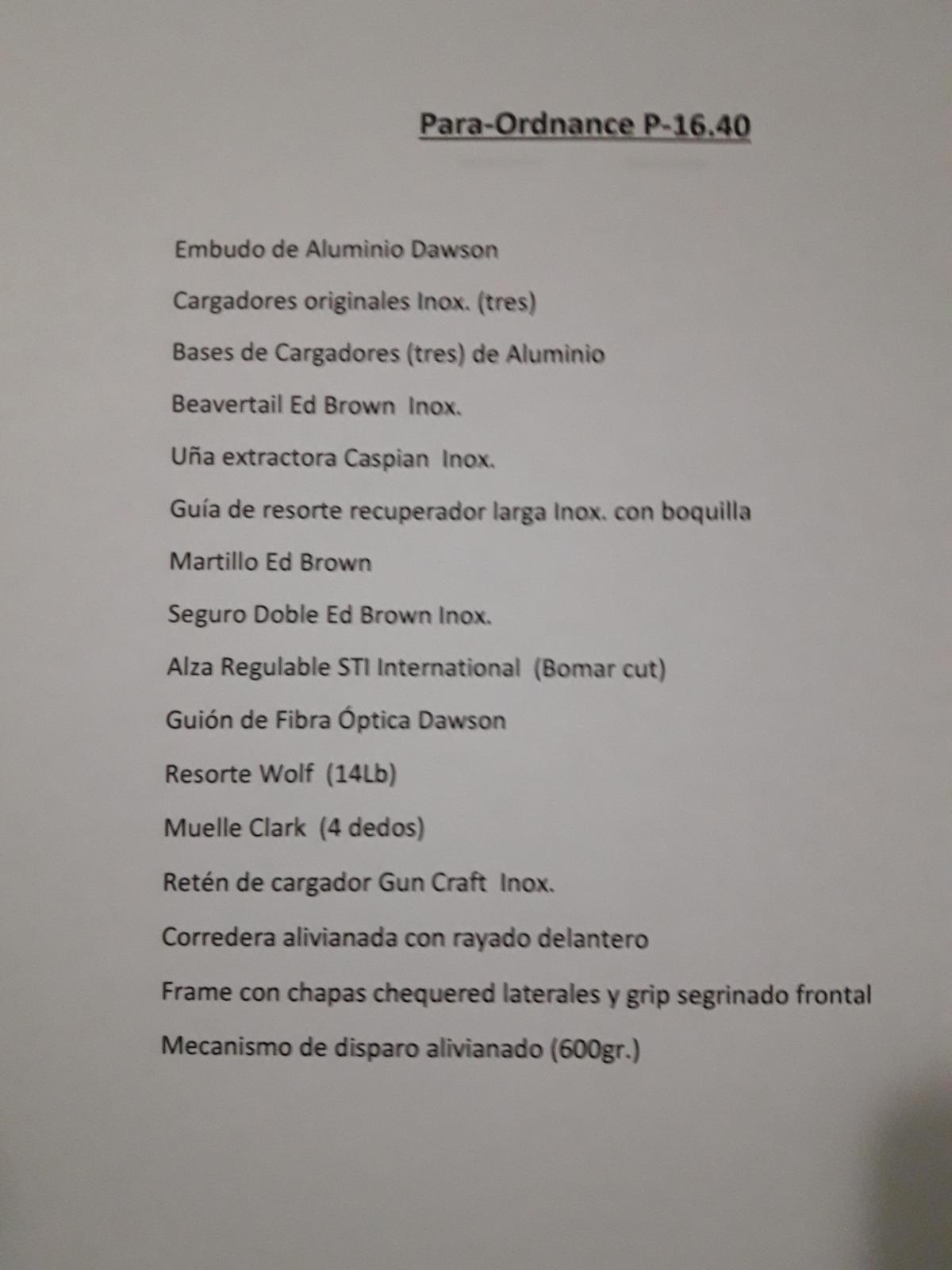Vendo excelente pistola marca Para Ordnance modelo P 16-40 calibre .40S&W, toda de acero inoxidable, made in Canadá. Totalmente customizada para Tiro Práctico en la División Standard con repuestos y accesorios importados de primera calidad y tres cargadores de 18 tiros (ver detalle en la última foto). Con muy poco uso comprobable por entendidos. Tiene CUIM asignado. No permuto. Haga sus consultas antes de comprar. Ver mis otros artículos publicados.