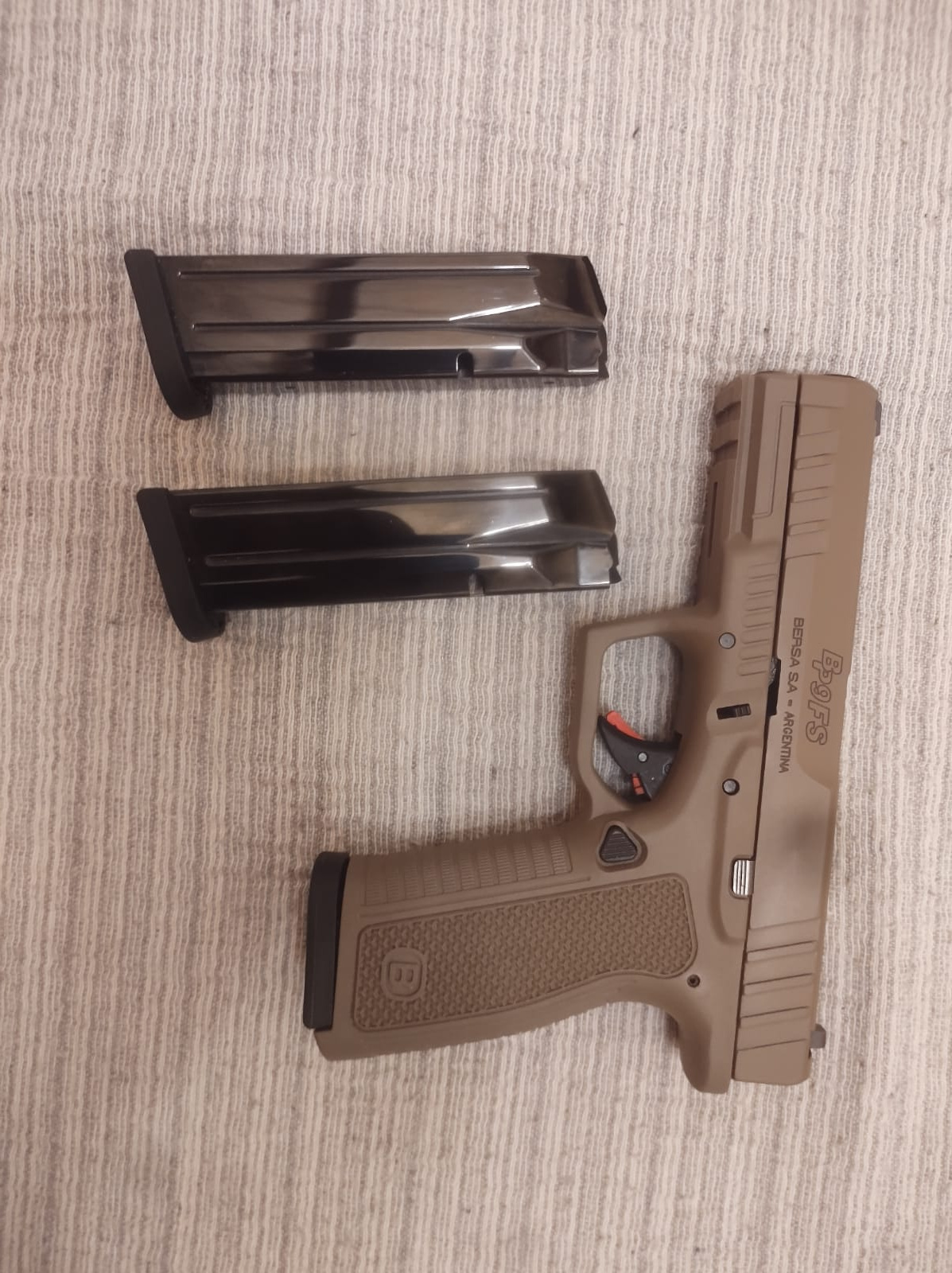 Pistola Bersa BP 9 FS (17+1) viene con su caja original, manual, garantía. Posee 3 cargadores originales. Pocos disparos (180 factory) muy pegadora, cañón pintado con epoxi, adjunto blanco a 8/9 mts (50 tiros)