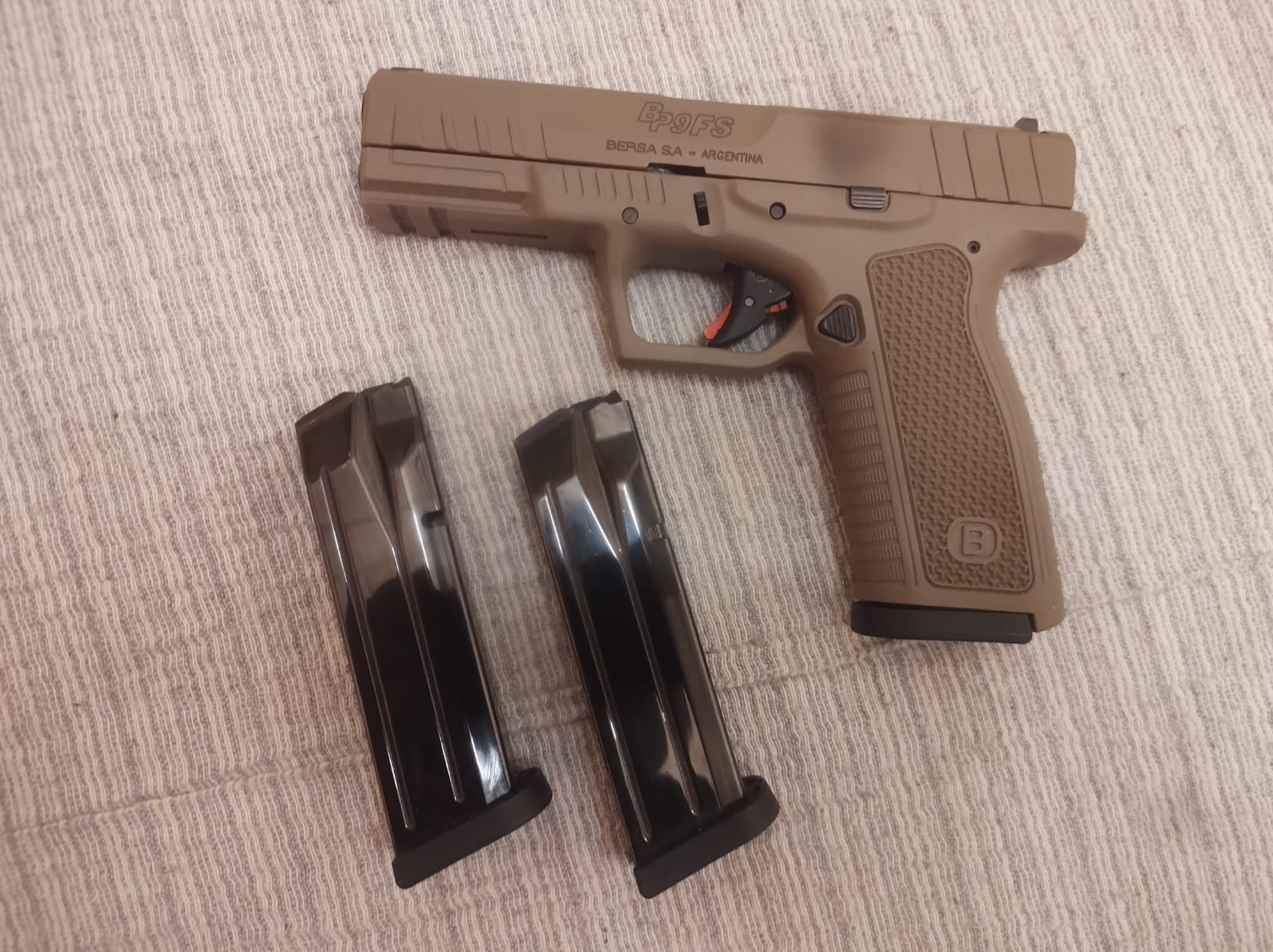 Pistola Bersa BP 9 FS (17+1) viene con su caja original, manual, garantía. Posee 3 cargadores originales. Pocos disparos (180 factory) muy pegadora, cañón pintado con epoxi, adjunto blancos a 8/9 mts (50 tiros)