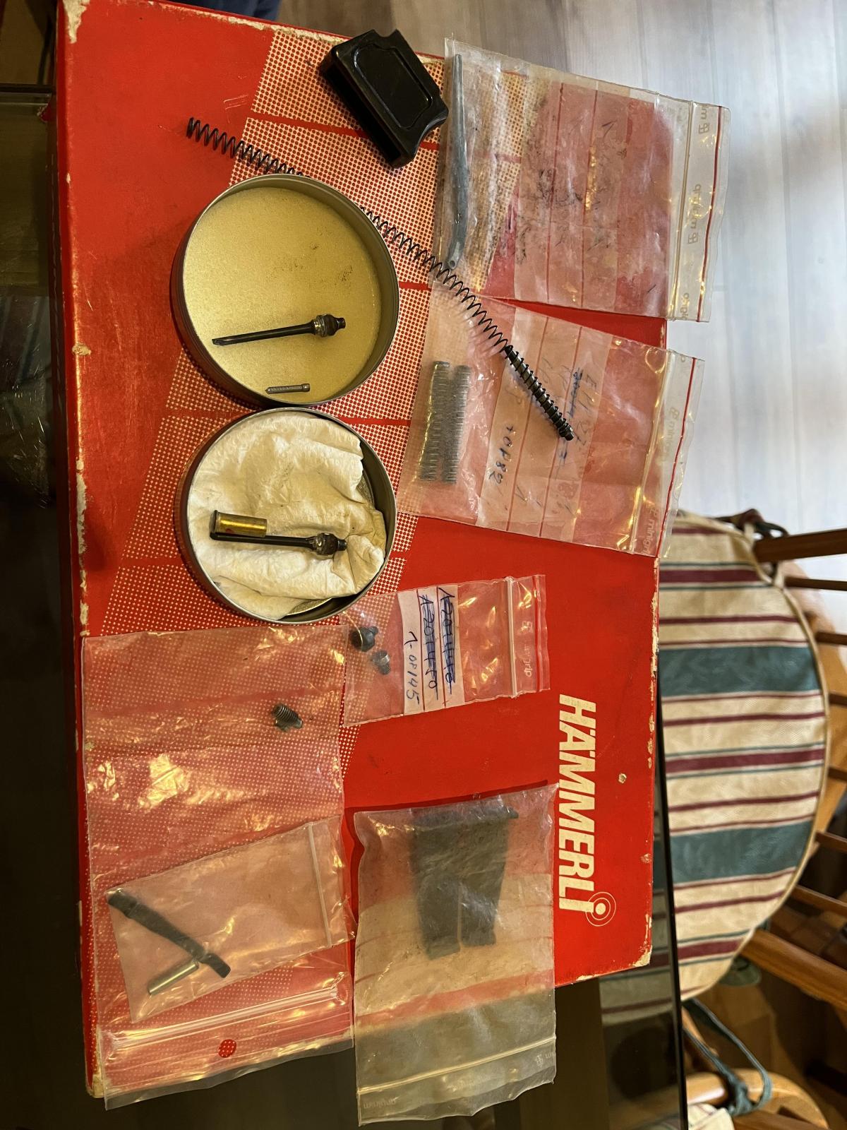 Incluye los repuestos de las fotos, caja y manual original. Con un alza de repuesto completa y cajón de percutor completo.