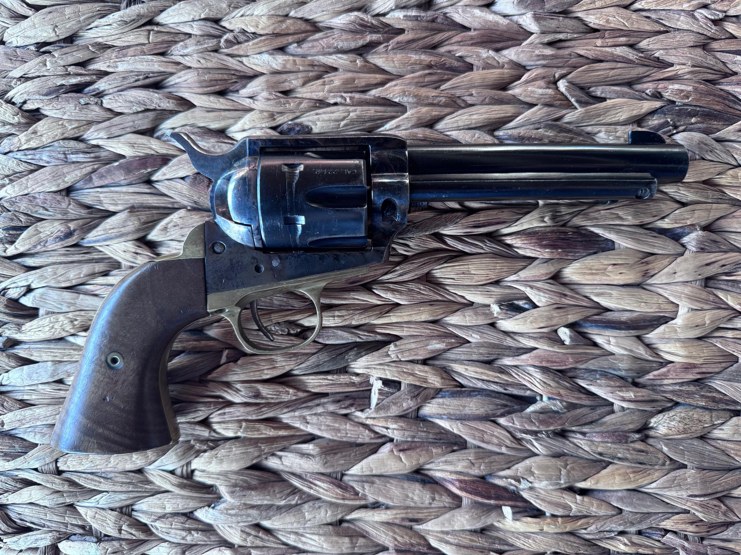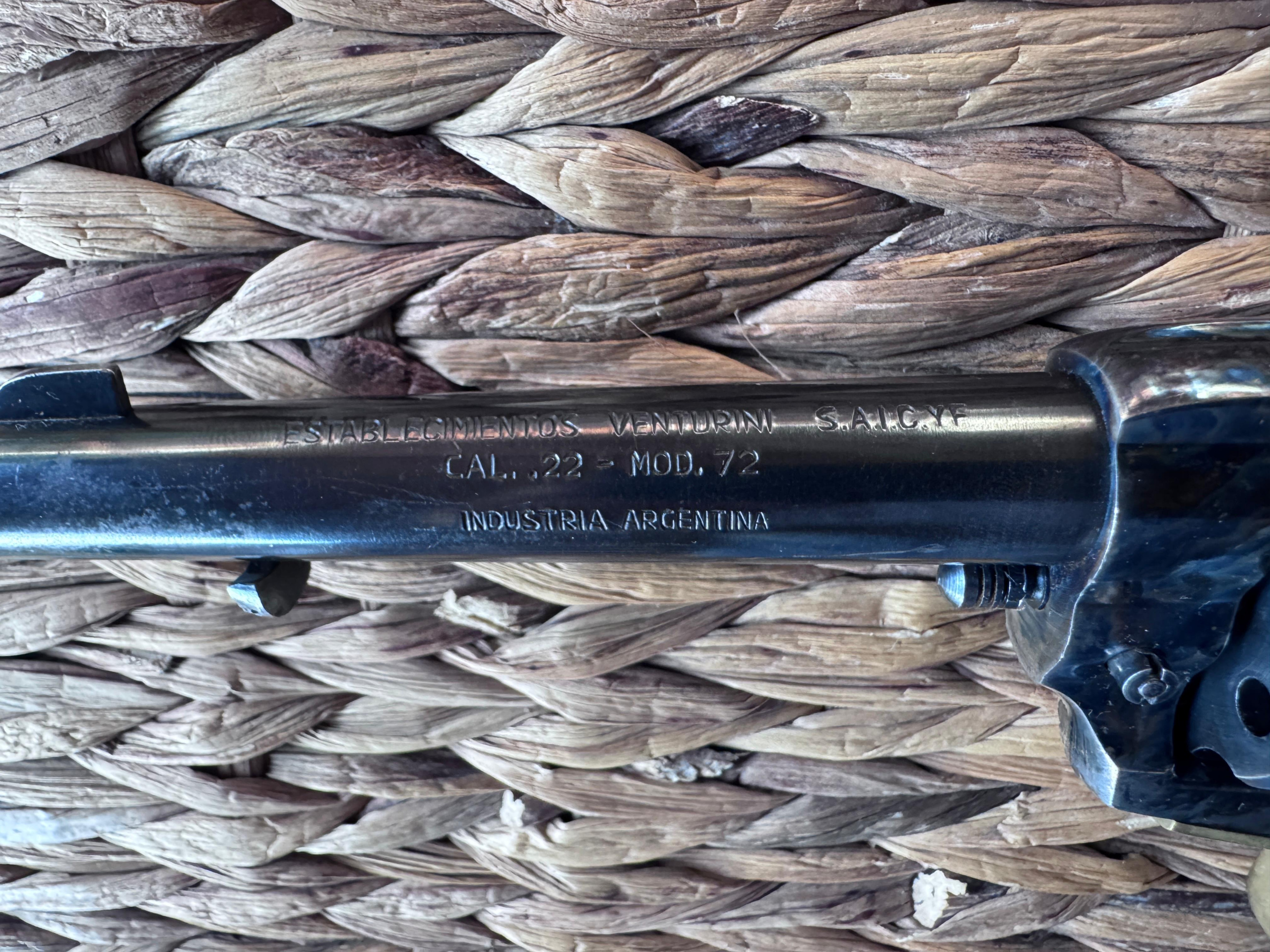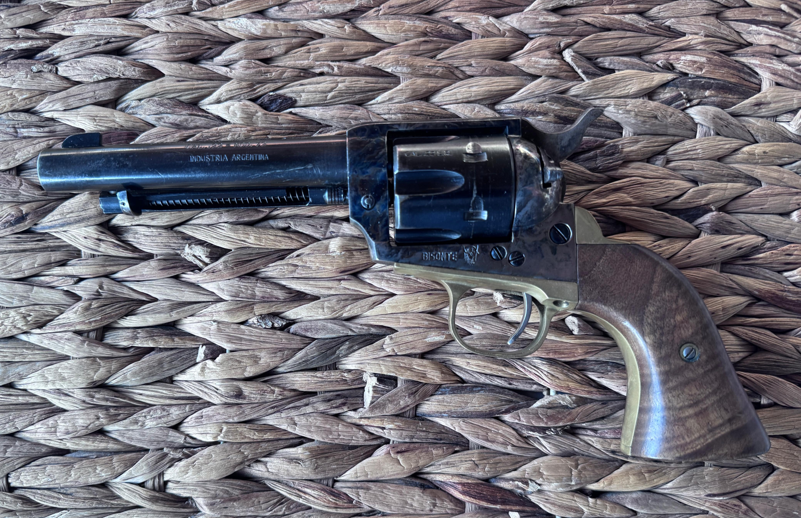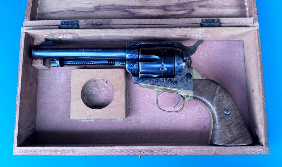 Revolver Simple Acción marca Rubí Modelo Bisonte del calibre .22LR. Cachas originales. Caja de madera original con algunos detalles. El revólver cuenta con CUIM. En excelentes condiciones.