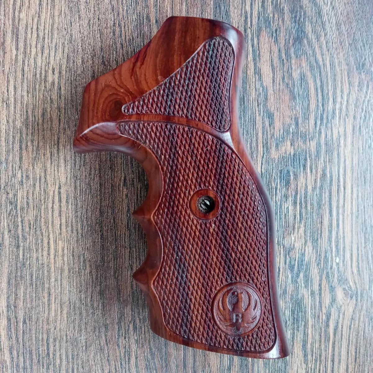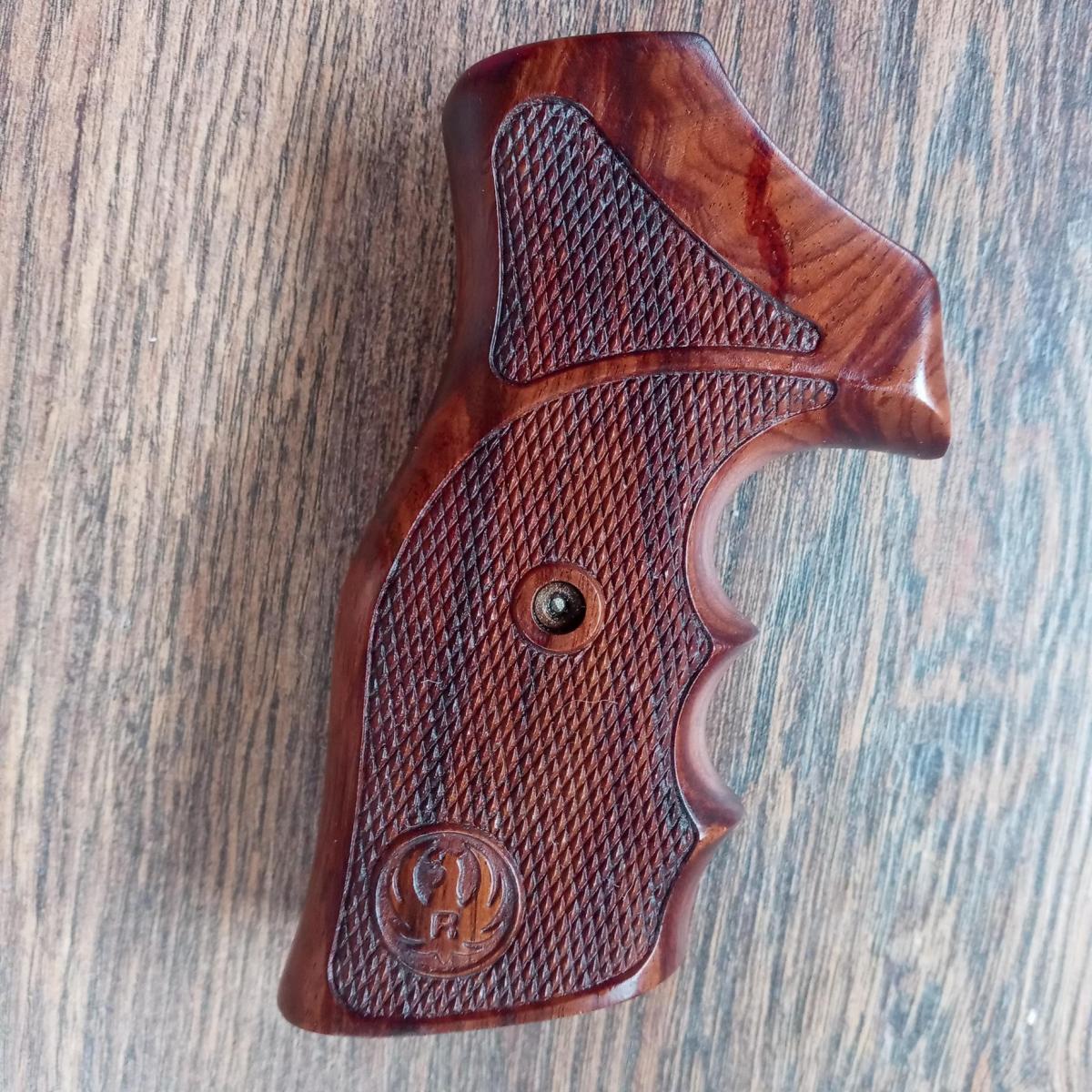 Cachas de madera exotica para revolver GP 100 / super redhawk , en rosewood, hermoso veteado y color natural (no teñidas) grip anatomico con fino segrinado en diamante y logo.