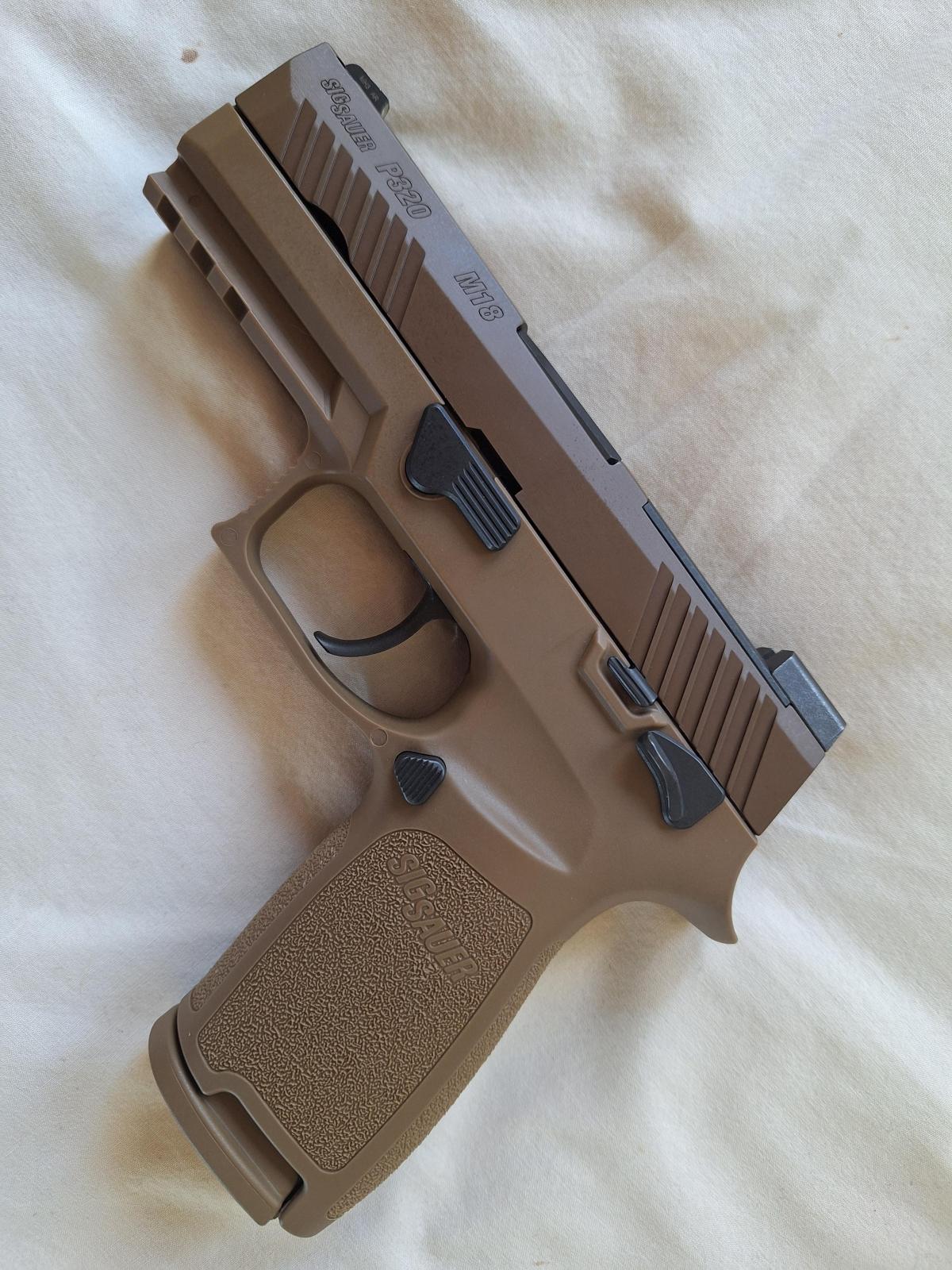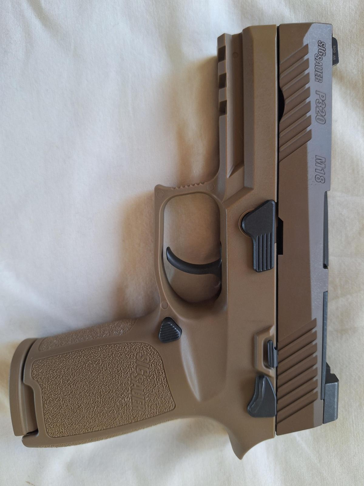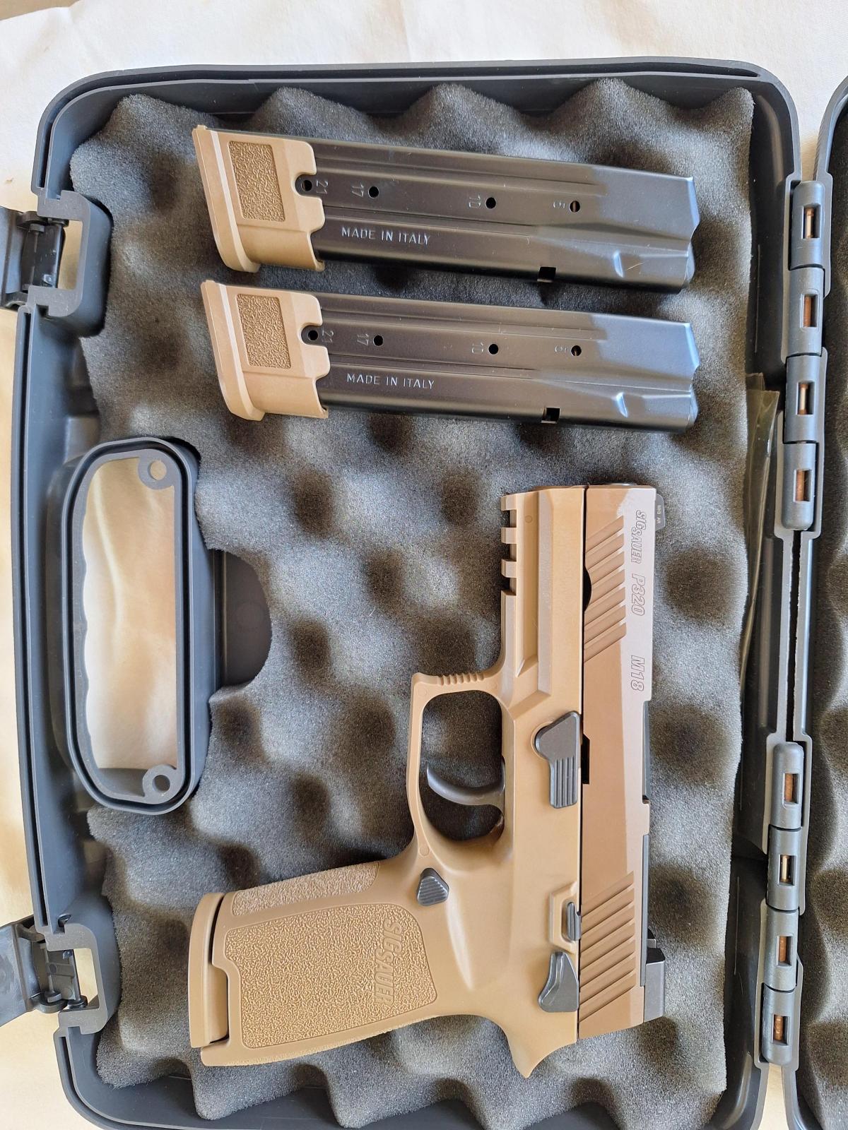 SIG SAUER P320 M18, calibre 9x19mm. En excelente estado. Con sus 3 (tres) cargadores, 1 de 17 cartuchos y 2 de 21 cartuchos de capacidad. Con miras de Tritium y seguro manual.