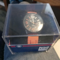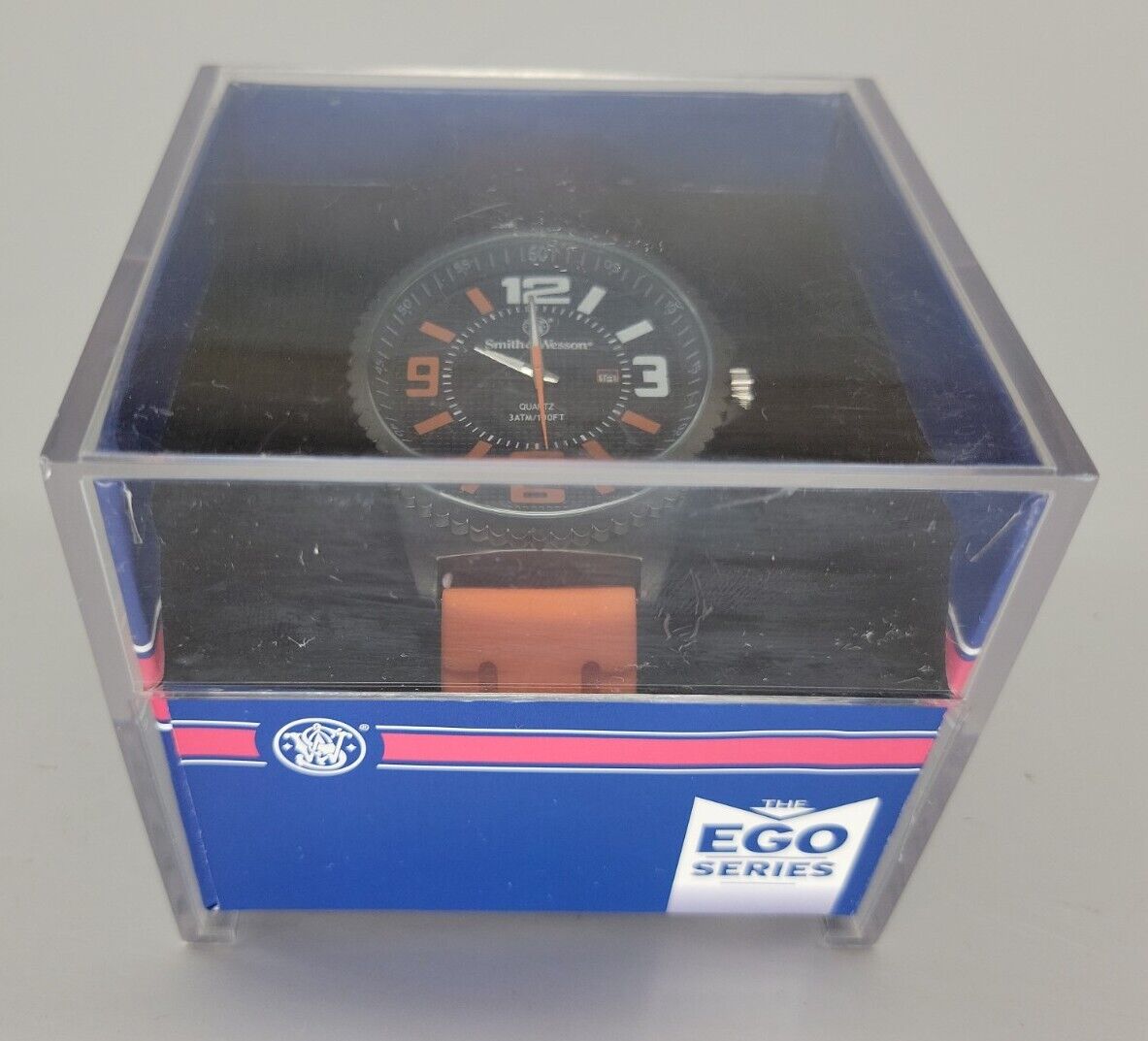 Reloj de pulsera mith & Wesson® con carátula grande. Serie EGO, CampCo. Nuevo en caja /no trae folleteria/. Banda de goma naranja. Forma del reloj:Redondo