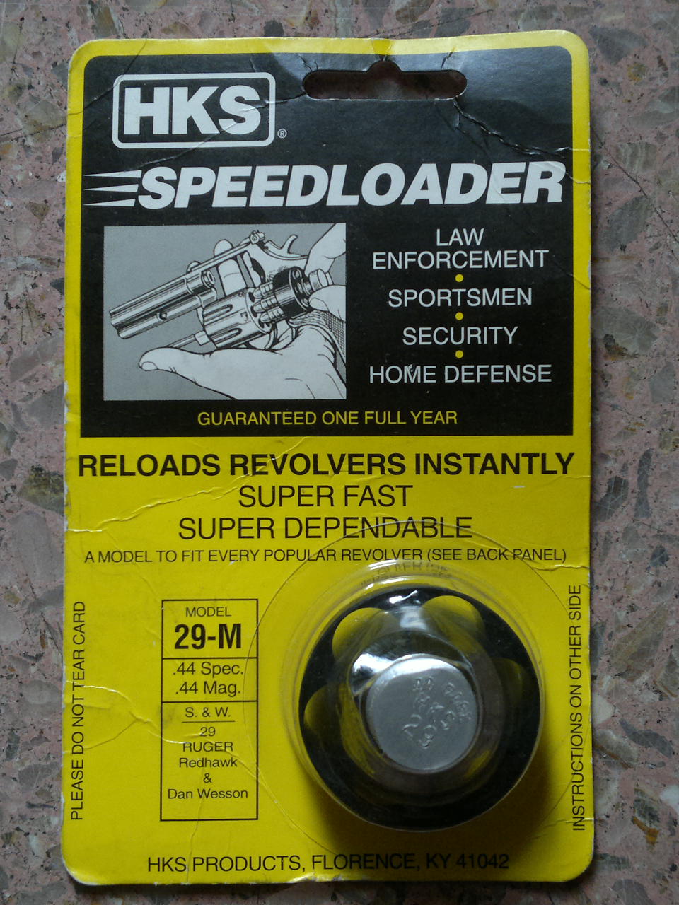 SPEEDLOADER MARCA HKS, MODELO 29-M .44 SPC /  MAG. PARA MODELOS DE REVOLVERES S&W 29, 629, TAURUS 441, RUGER REDHAWK, SUPER REDHAWK, DAN WESSON. (TODOS DE 6 TIROS). NUEVO EN SU BLISTER A ESTRENAR.